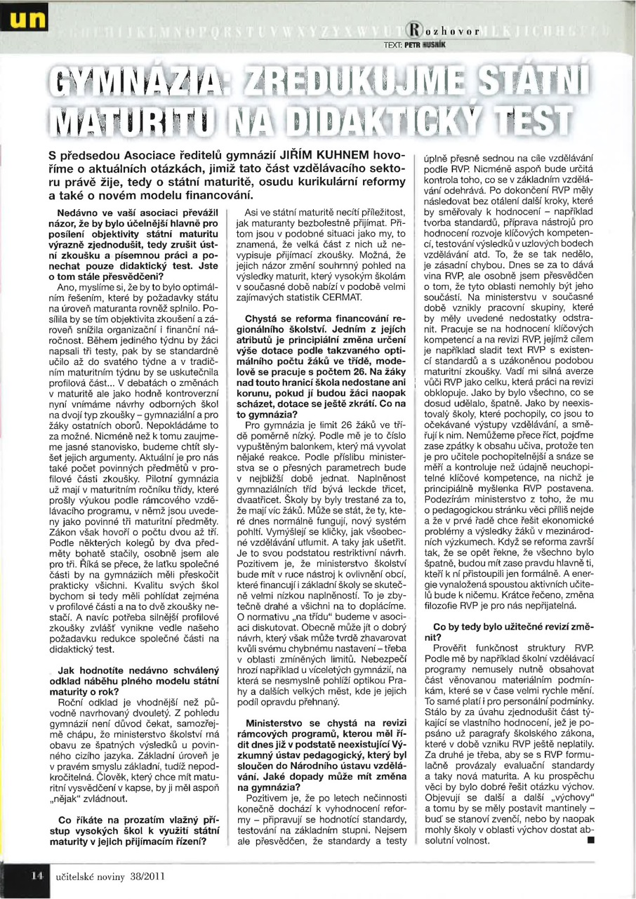 Asociace ředitelů gymnázií ČR se pravidelně vyjadřuje k aktuálním otázkám vzdělávání. Článek v Učitelských novinách "Gymnázia: Zredukujme státní maturitu na didaktický test!" se ohlíží k prvním maturitním zkouškám, které se konaly podle nových pravidel, věnuje se problematice dalšího osudu kurikulární refomy a komentuje možnosti chystaného modelu financování regionálního školství.