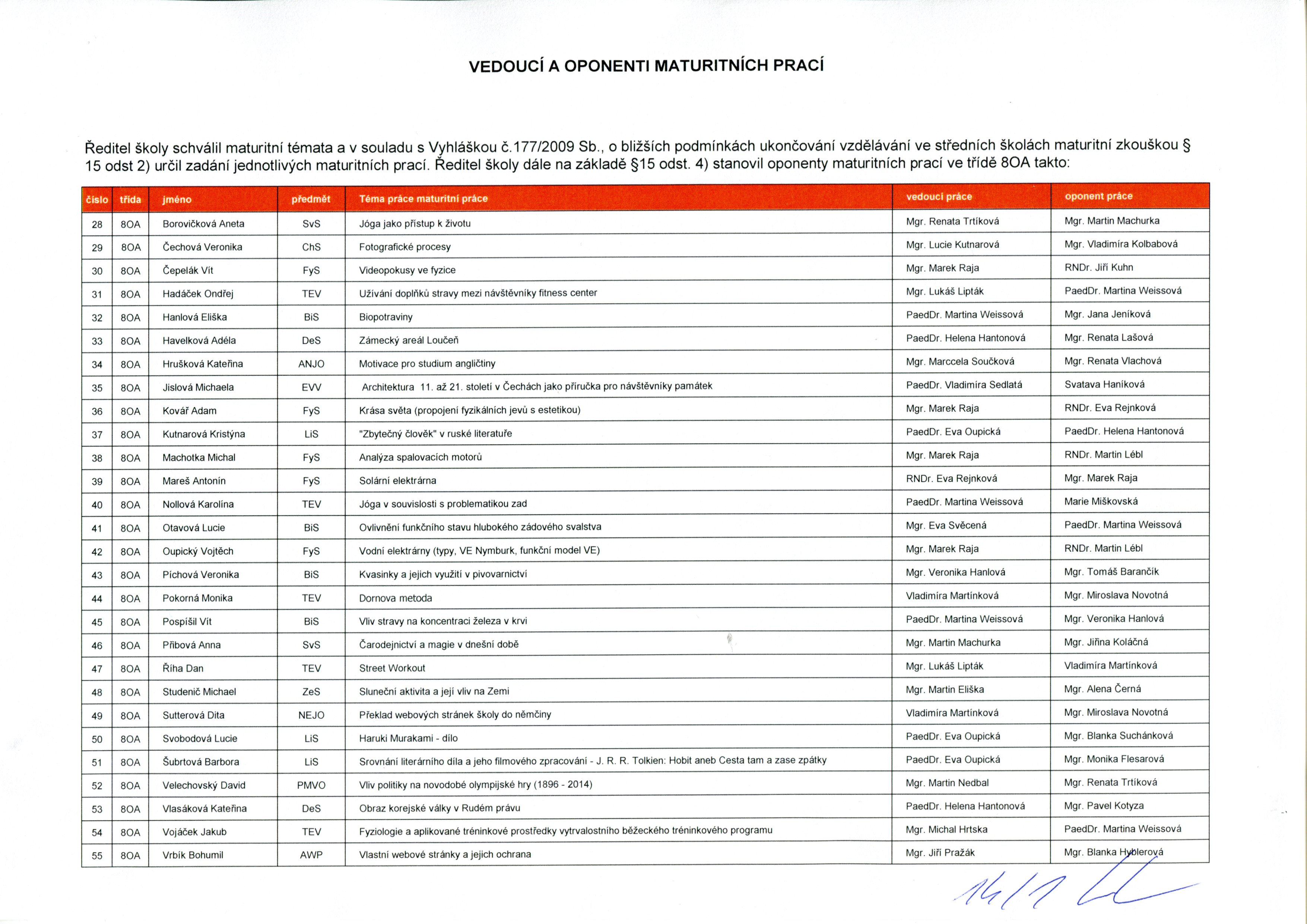 Ředitel školy schválil maturitní témata a v souladu s vyhláškou č. 177/2009 Sb., o bližších podmínkách ukončování vzdělávání ve středních školách maturitní zkouškou, § 15 odst 2) určil zadání jednotlivých maturitních prací. Ředitel školy dále na základě § 15 odst. 4) určil vedoucí maturitních prací v třídách 4A, 8OA, 8OB.