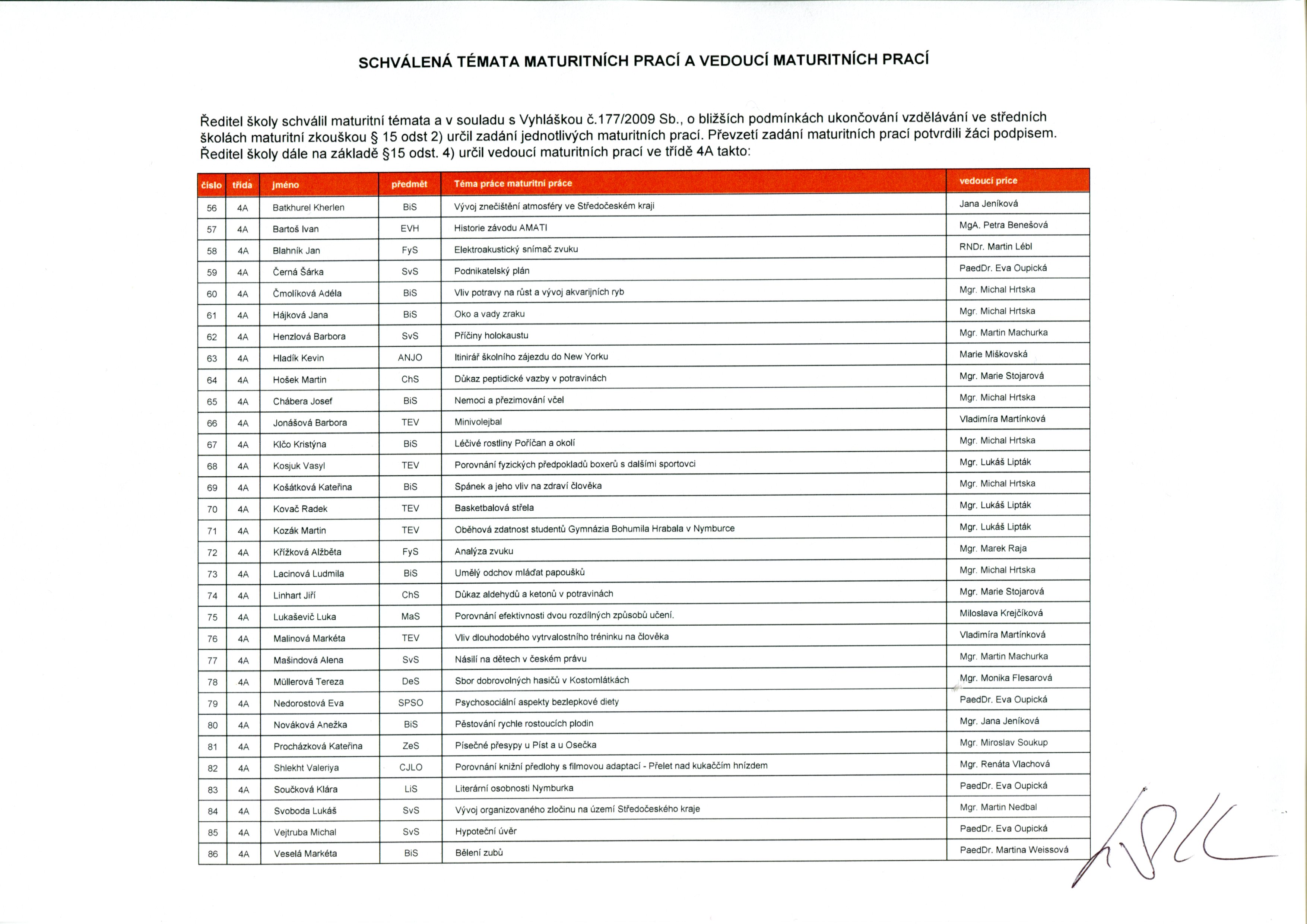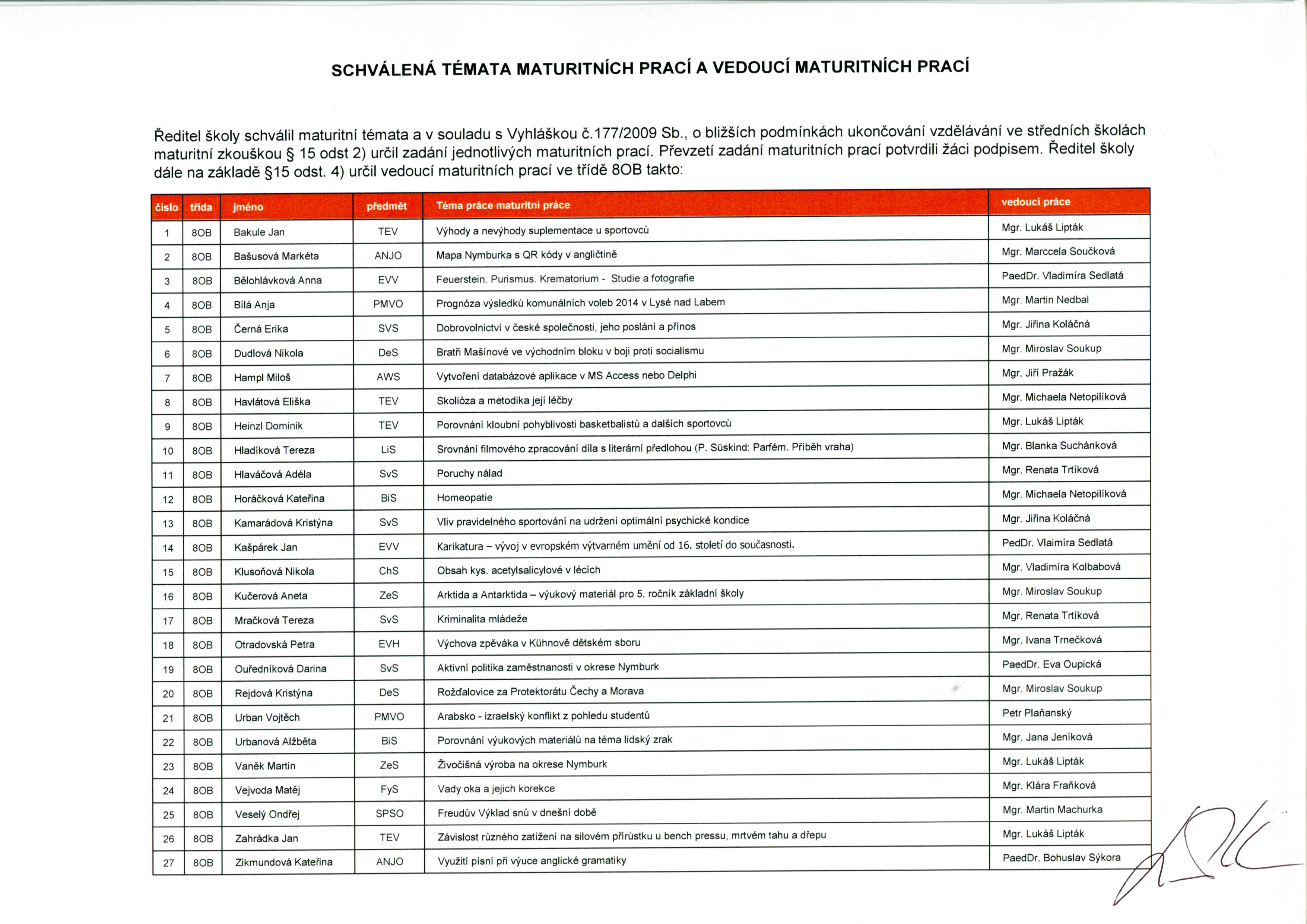 Témata maturitních prací pro školní rok 2025-26 byla zveřejněna ředitelem školy, RNDr. Jiřím Kuhnem, 3. 3. 2025. Zadání maturitní práce obdrželi žáci 10. 10. 2025.